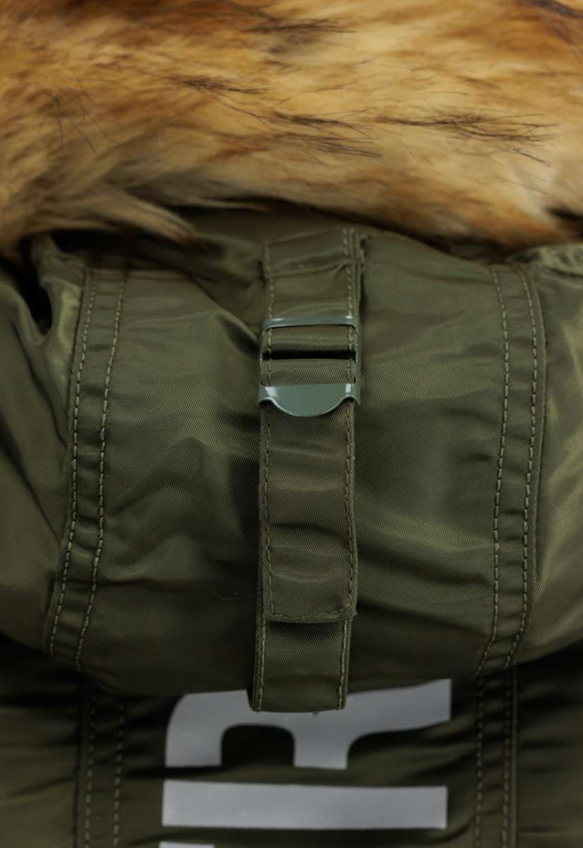 "German: wattierte Jacke, Klettpatch auf Brust, reflektierender Druck auf Rücken, abnehmbarer Kunstpelz, Kapuze verstellbar