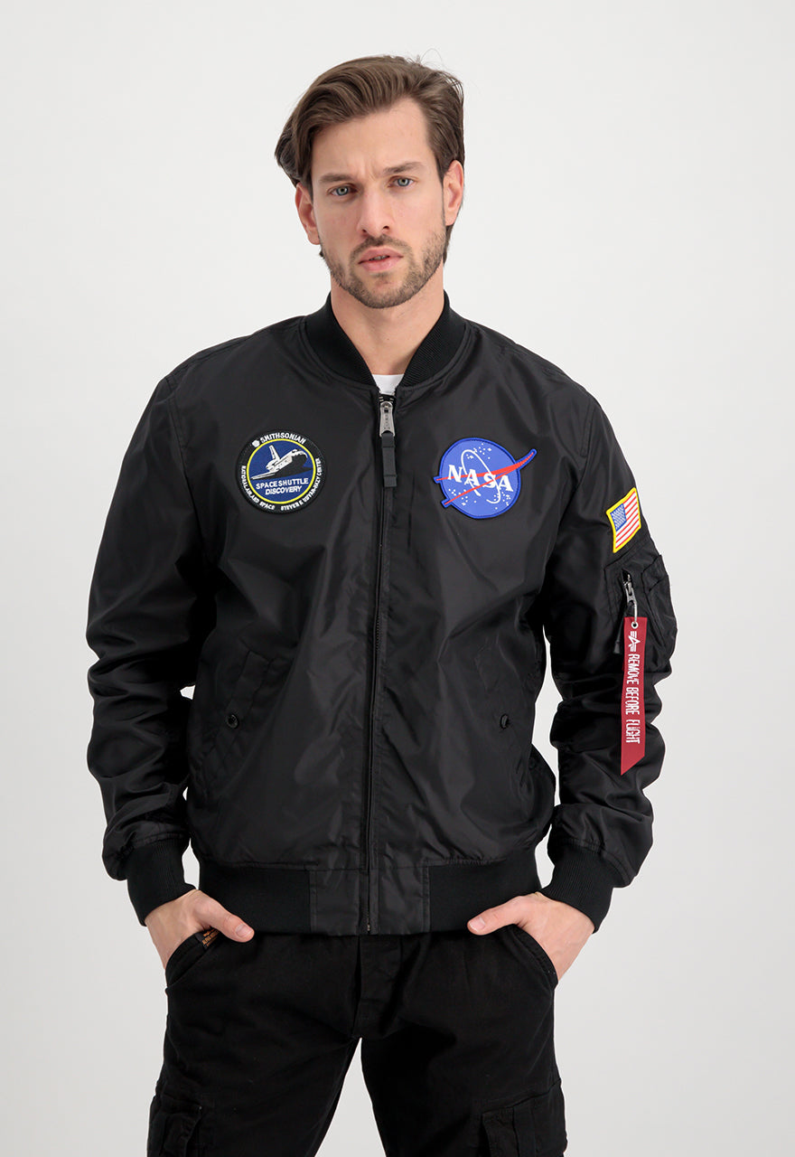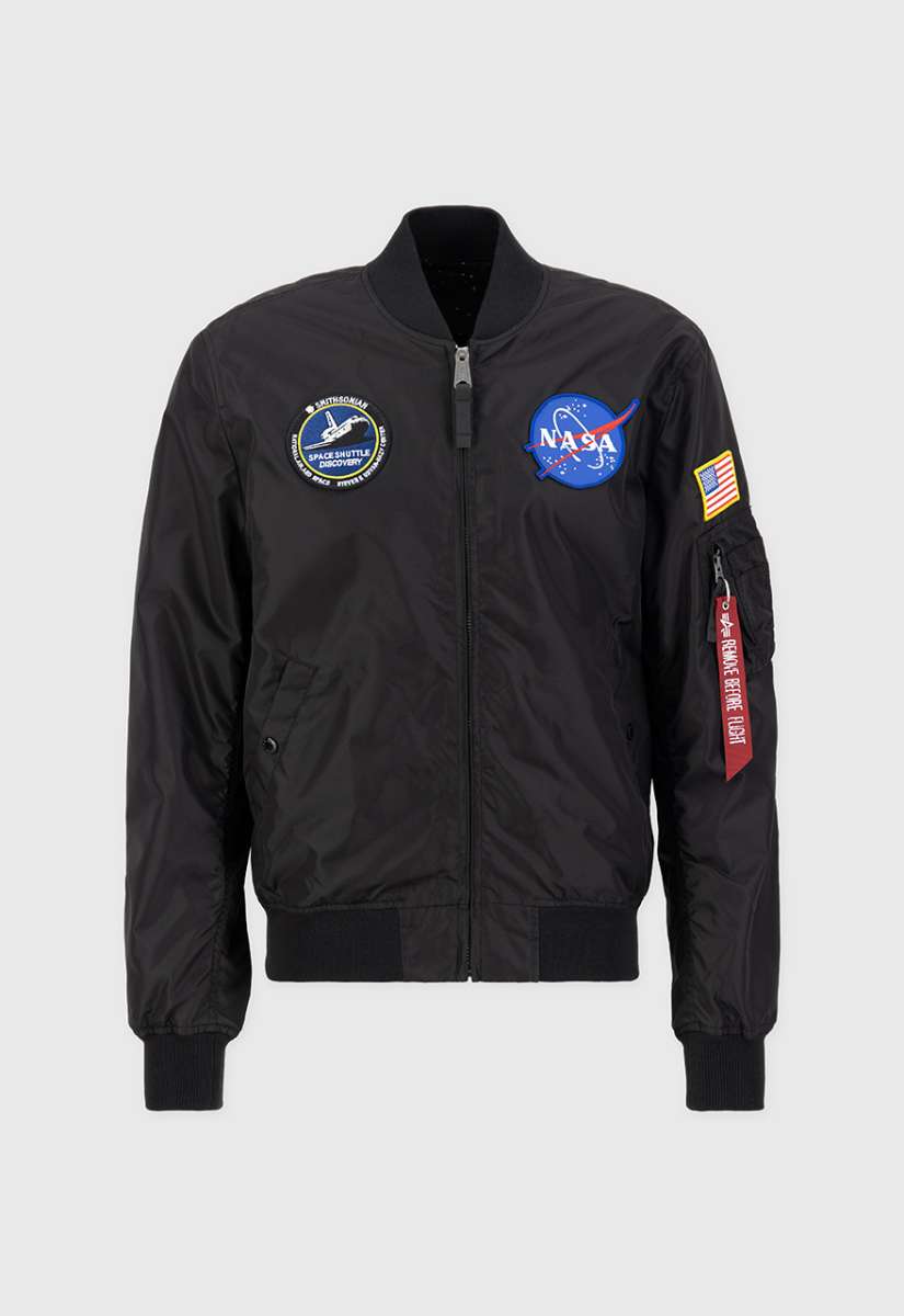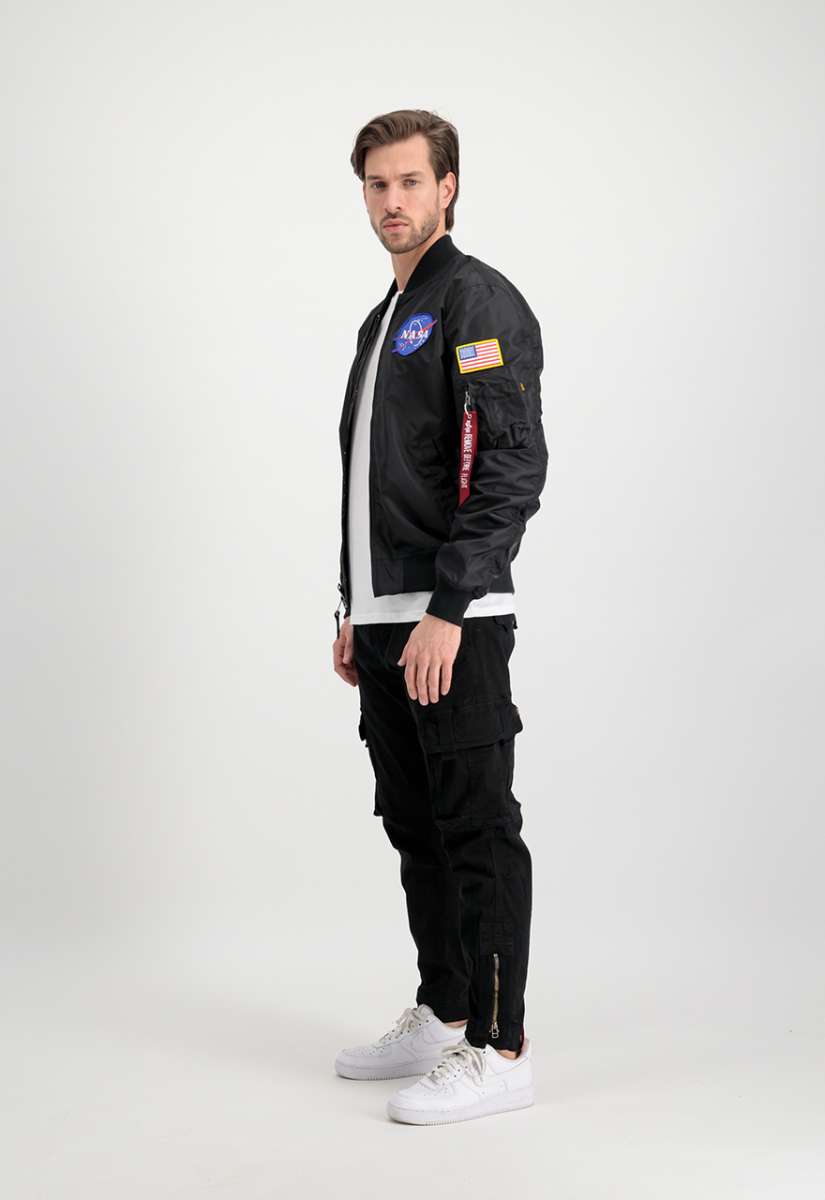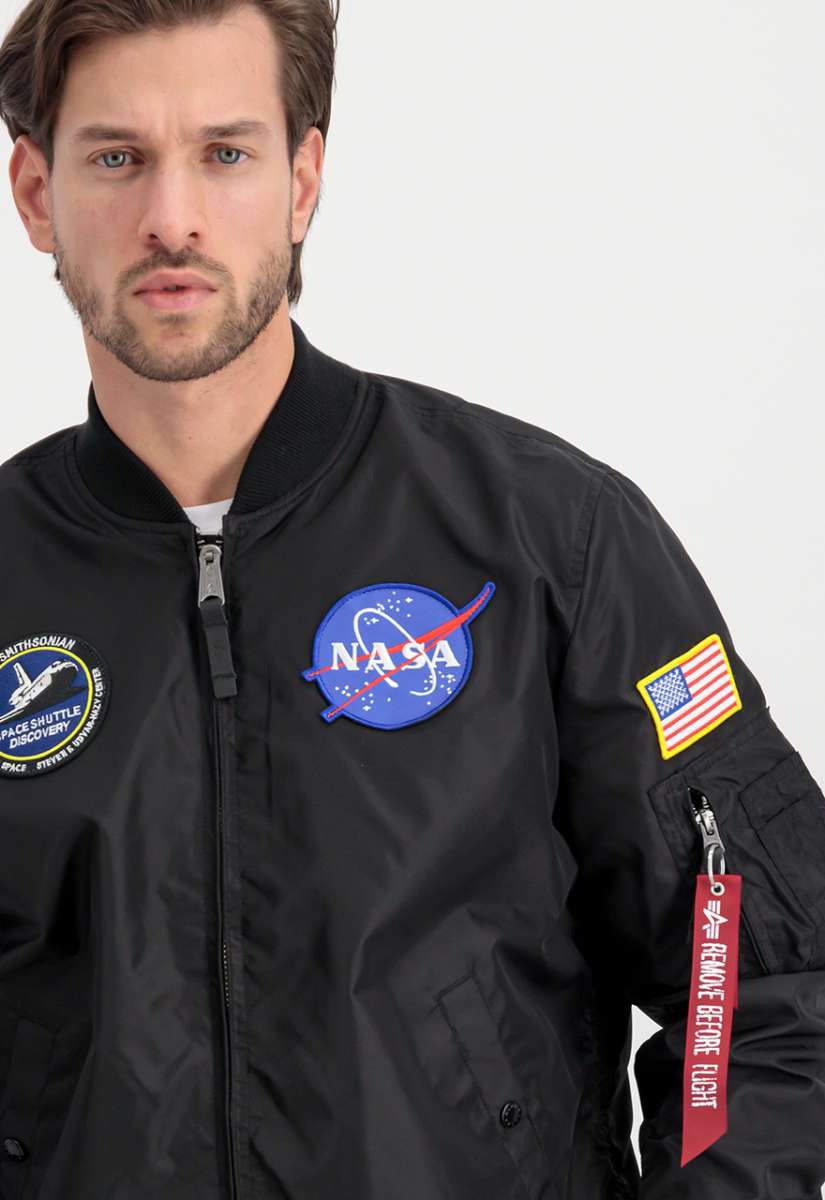 verschiedenen NASA Patches auf der Brust verleihen der Jacke einen authentischen Raumfahrt-Touch. Die Utility Pocket mit RBF Tag und die USA Flagge auf dem linken Ärmel betonen den charakteristischen Alpha