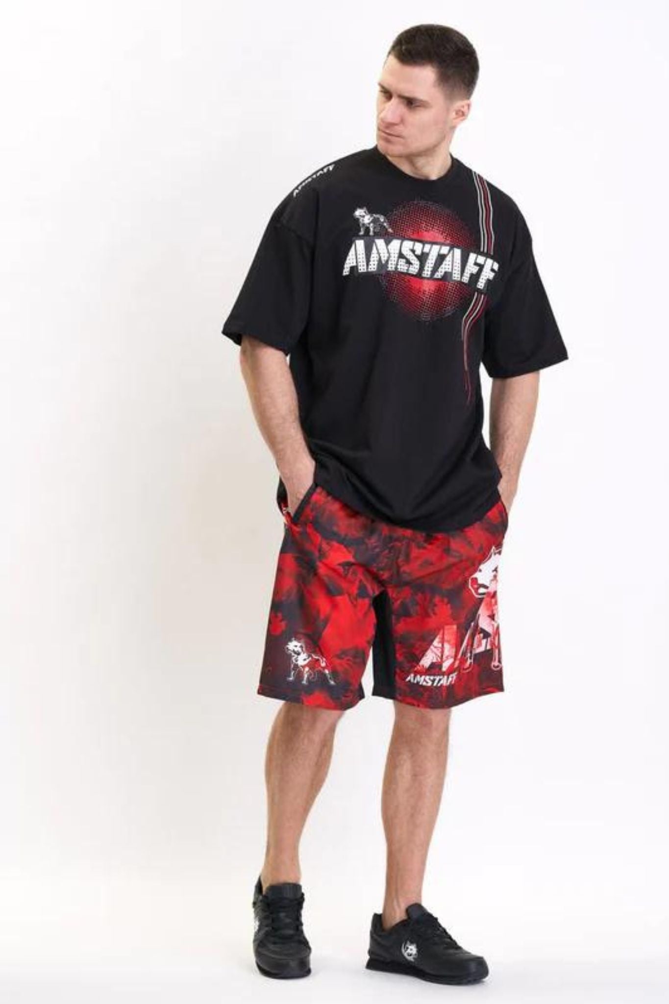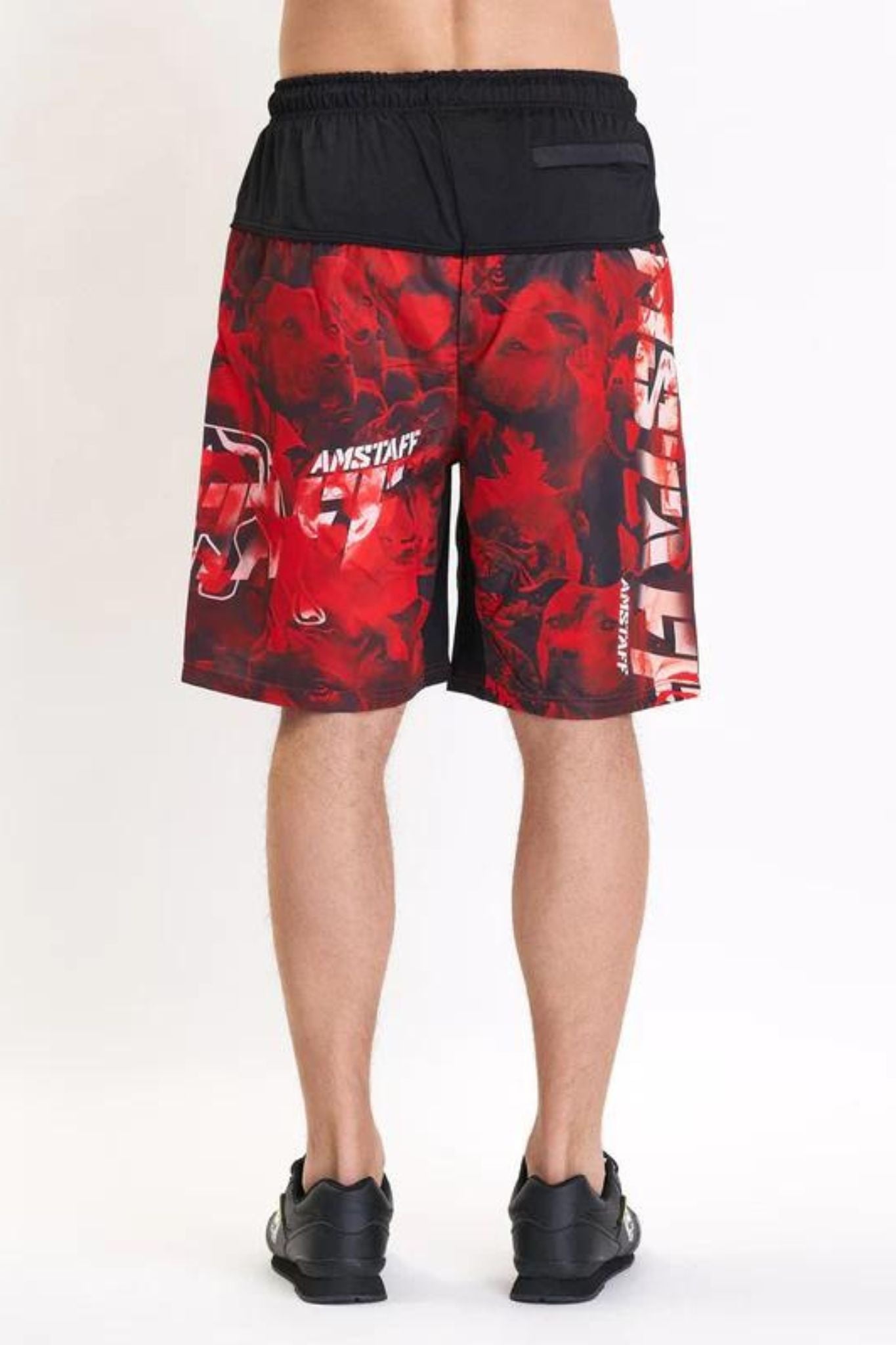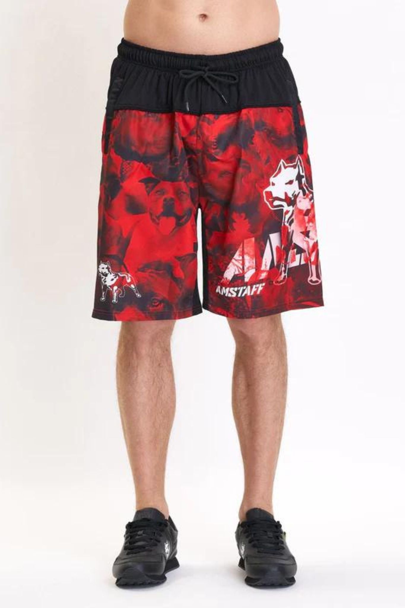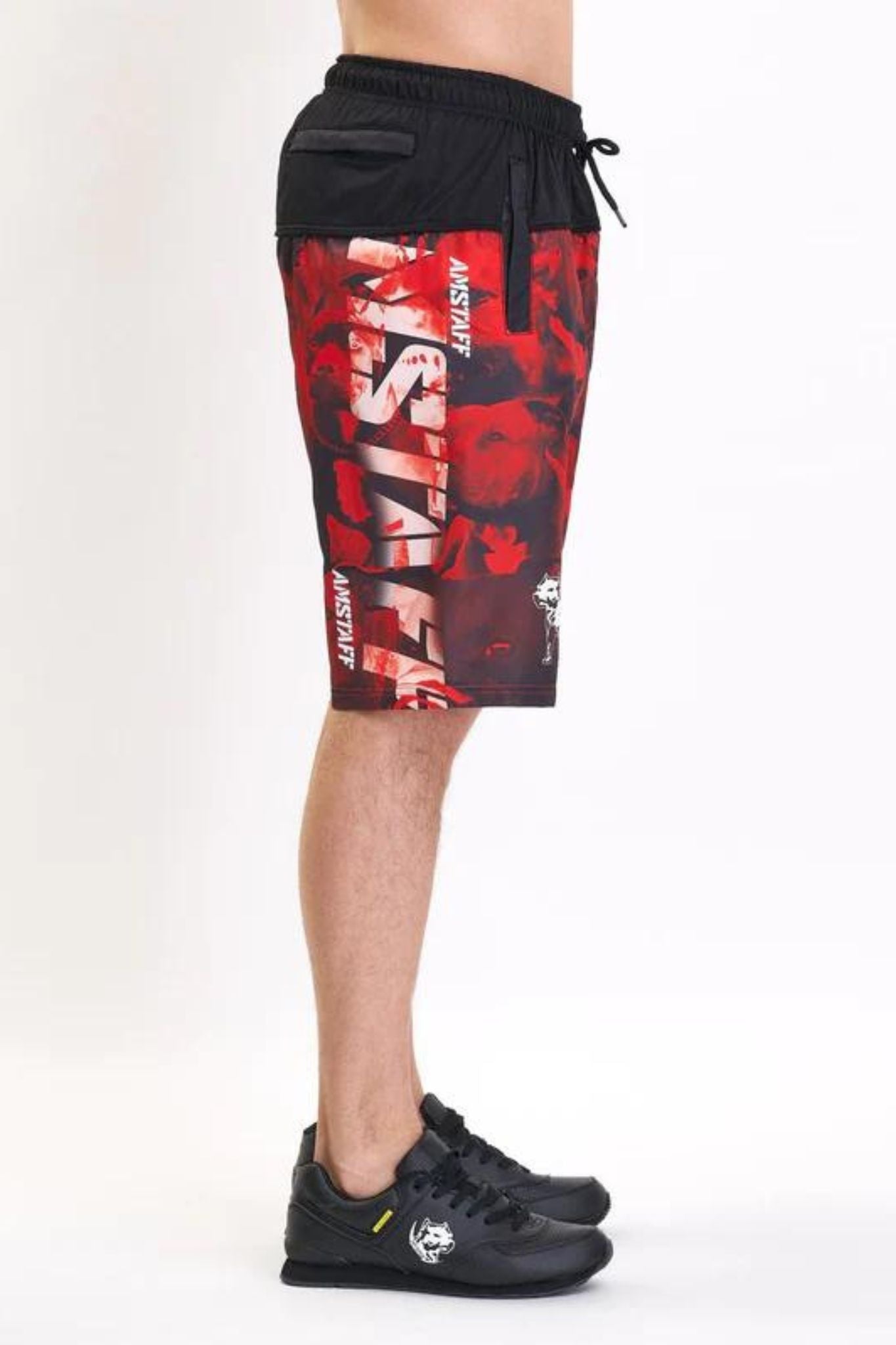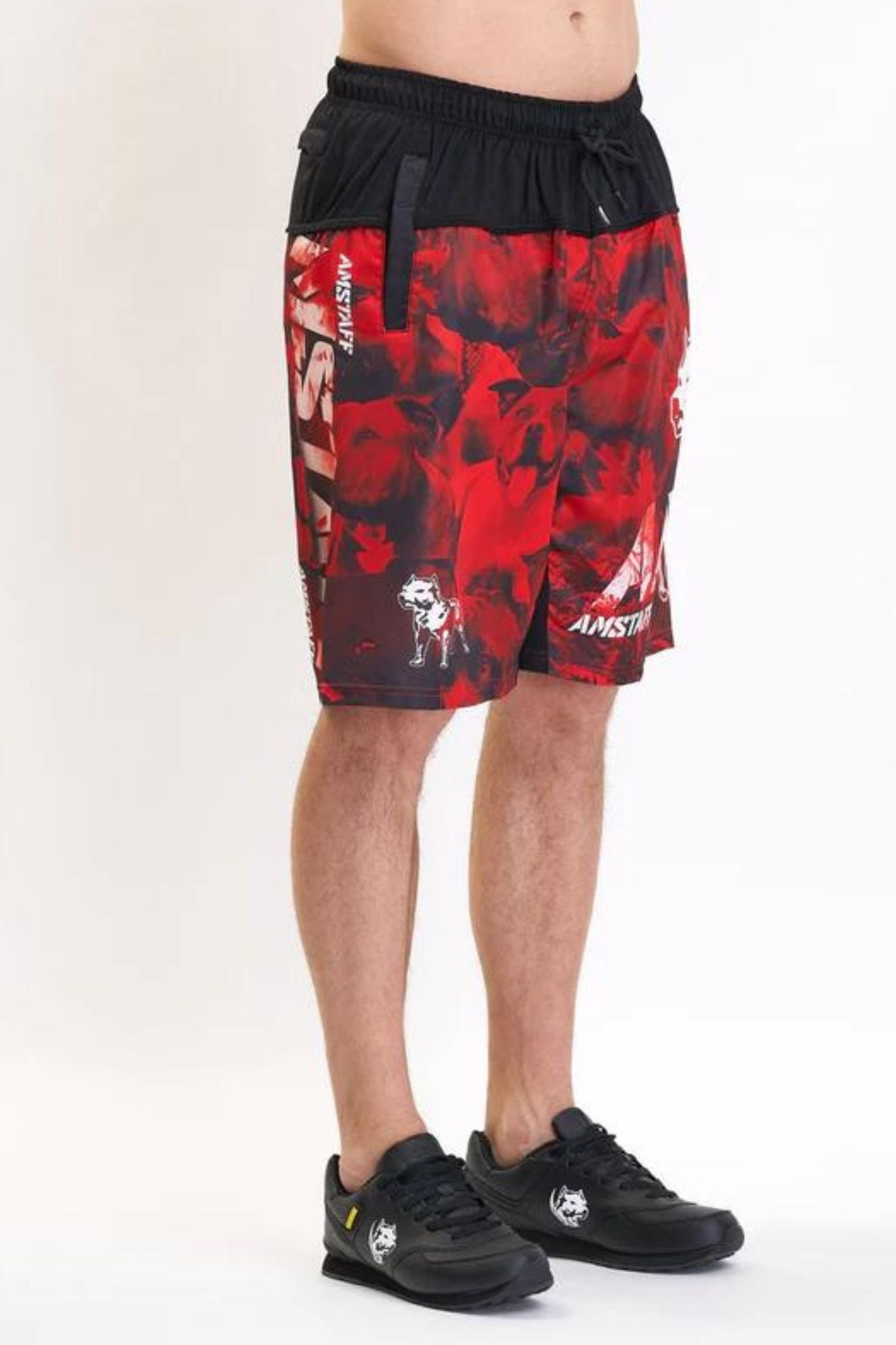 Freshe Swimshorts der Marke Amstaff. Schwarz Rote Design mit coolen Kratzern. Cooler und Dynamischer Amstaff Motiv mit Kalligraphie Schriftzügen.