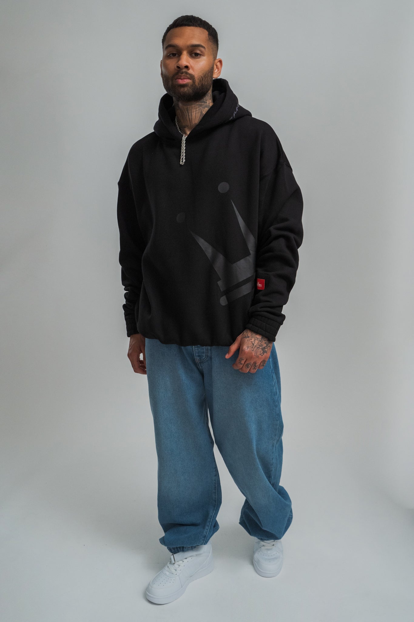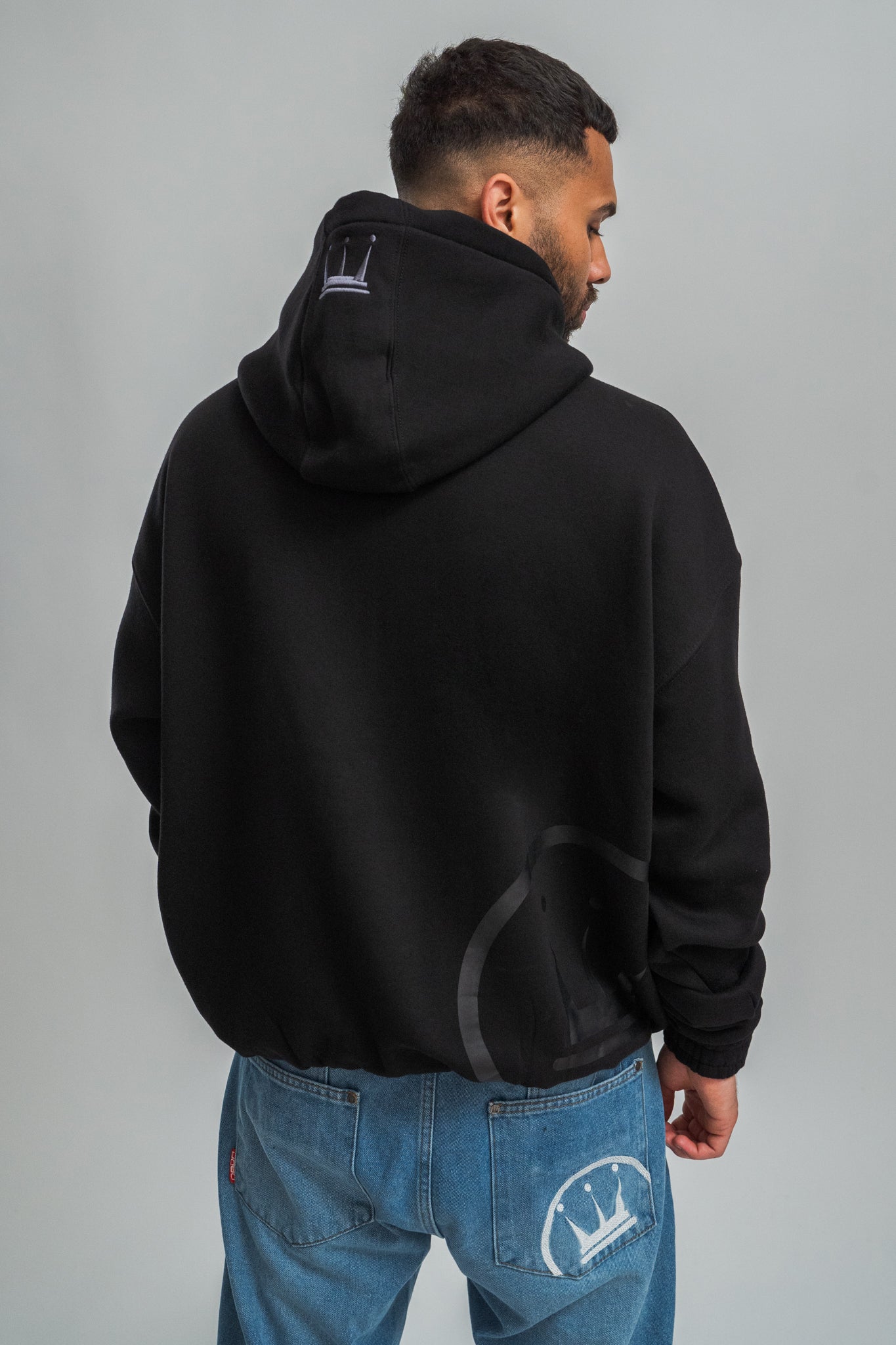 - 2 Logo Stickereien auf der Kapuze, eine an der Seite und eine Krone hinten